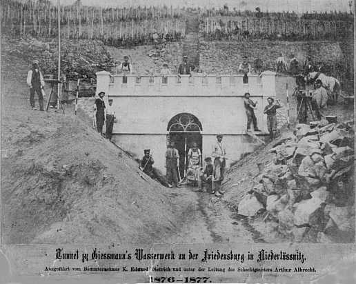 Zum Zwecke der Wasserversorgung seines Grundstücks und der Nachbargrundstücke ließ Gießmann, der Besitzer des Badhotels, einen Tunnel durch den Berg treiben, von der Burgstraße bis in die Nähe vom Schwarzes Teich im Waldpark, 309 m lang, 2 m hoch und 1 m breit, davon 34 m ausgemauert.