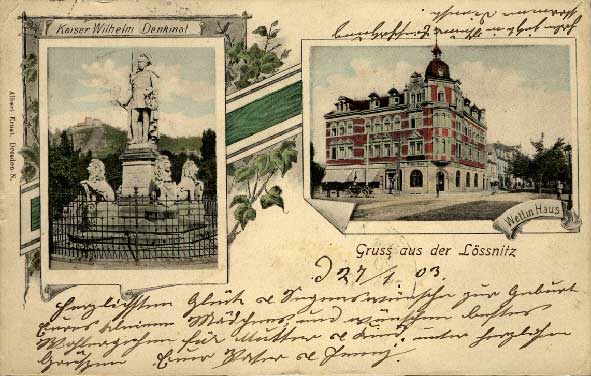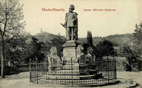 1932 , beim Ausbau der östl. Königstr. wurde das künstlerisch wertlose Denkmal von Kaiser Wilhelm I., im Volksmund "Pudeldenkmal" genannt, wegen der geschmacklosen schildhaltenten Löwen, als verkehrsstörend beseitigt, und die Kaiserfigur auf dem damaligen "Ludendorffplatz" (ehem. Königsplatz, jetzt Rosa-Luxemburg-Platz) in einer Ecke aufgestellt.