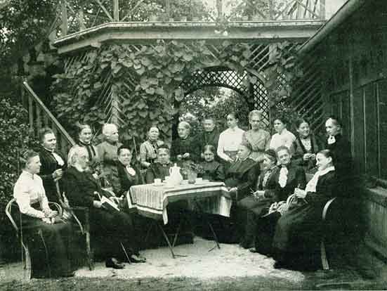 Pfarrer Schöpff im Kreise seiner Getreuen beim "Stricken", um 1890