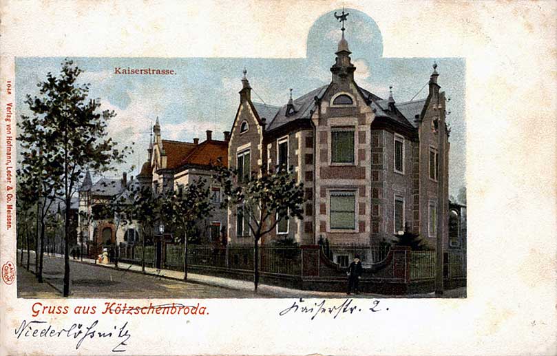 Postkarte um 1900 mit Blick in die Kaiserstraße - das Eckgrundstück Nr.2 ließ Otto Teske erbauen, die anderen Villen stehen auch auf seinem ehem. Grundbesitz.
