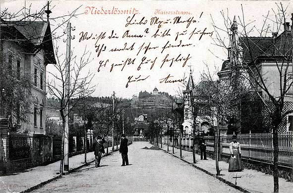 Postkarte um 1910: Blick in die Kaiserstraße, alles ehem. Land von Otto Teske. Oberhalb des Denkmals war die Straße von der Gemeinde geplant, konnte aber nicht ausgebaut werden, weil die Anwohner (O.Teske) sich weigerten ihren Besitz dazu herzugeben. Das gab natürlich gewaltgen Ärger !