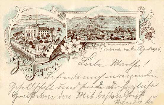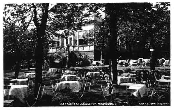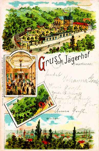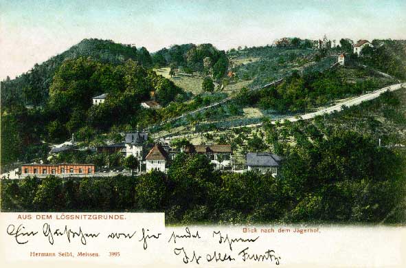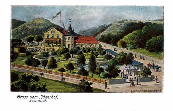 Zum Jägerhof - Wein-Restaurant und Café 1.Ranges - Niederlößnitz - 10 Min. von Haltestelle "Weißes Roß", Aufgang Paradiesstraße - Eröffnung Sonnabend, 14.Mai - Staubfreie, herrliche Lage mit Fern-Aussicht - Prächtig gepflegter schattiger Lindengarten mit Terrassen - Veranden, - Festsaal und Gesellschaftszimmer vornehmen Stils - Originelle Jägerstube